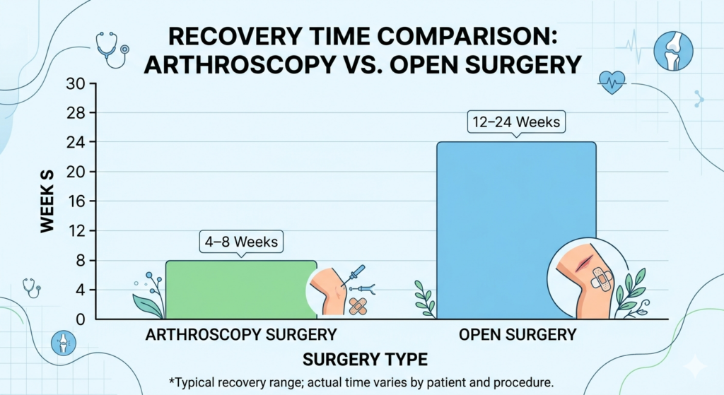 Full recovery timeAround 4–8 weeks for many knee proceduresAround 3–6 months for similar open procedures