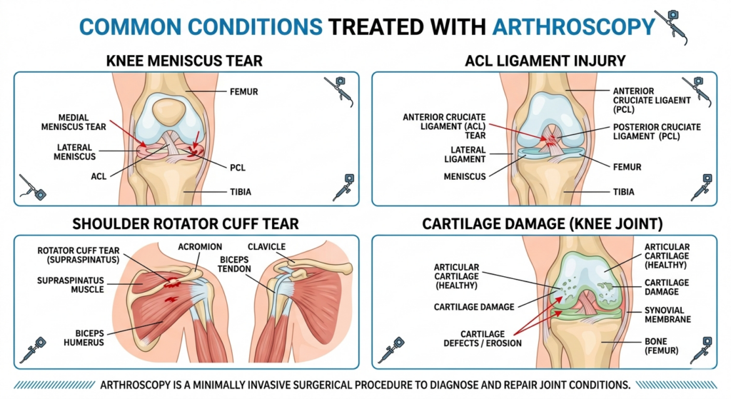 Arthroscopy can help diagnose and treat many joint problems, especially when X‑rays and scans are not giving clear answers. Common conditions include: