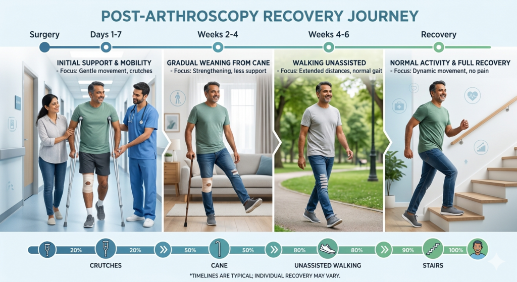 Because arthroscopy is minimally invasive, recovery is typically faster and more comfortable than open surgery. Many patients can walk with support within a few days, resume routine desk work in 1–3 weeks, and achieve good recovery of the joint in about 4–8 weeks for many knee procedures.