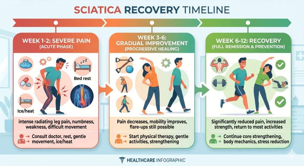 Acute sciatica often improves within 4 to 12 weeks. If pain persists beyond 3 months, it is considered chronic and needs medical evaluation from an orthopedic specialist.