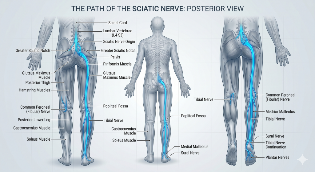 Sciatica is not a disease. It is a symptom. It refers to pain that travels along the path of the sciatic nerve, the longest nerve in your body. This nerve starts in your lower back, runs through your hips and buttocks, and goes all the way down each leg.