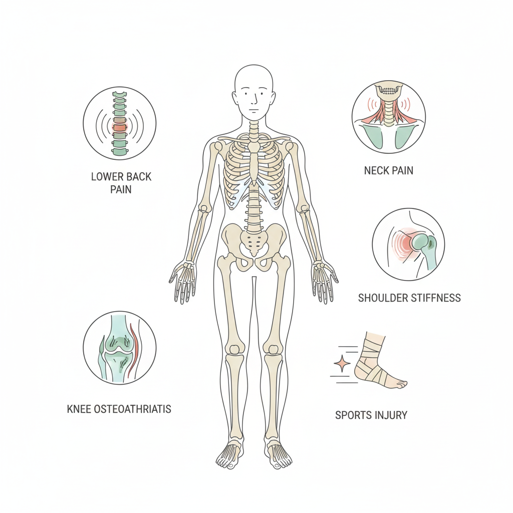 Common conditions requiring physiotherapy include knee osteoarthritis, chronic back pain, neck pain, post-fracture stiffness, ligament injuries, frozen shoulder, rotator cuff tears, and recovery after joint replacement or fracture surgery.