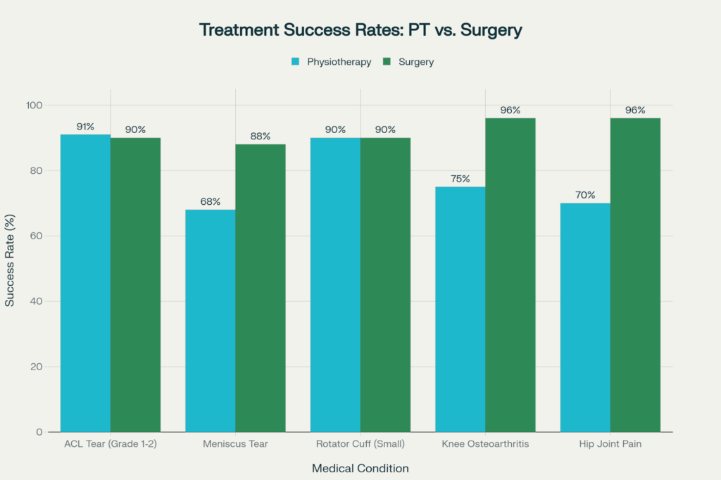 Neither is universally “better”—it depends on injury severity and type. Physiotherapy achieves 68-72% success rates and works excellently for mild-moderate injuries, Grade 1-2 ACL tears, and small rotator cuff tears. Surgery succeeds better for severe structural damage, Grade 3 tears, and failed conservative treatment. Research shows physiotherapy equals surgery for certain conditions (like small rotator cuff tears and lumbar stenosis) while producing fewer complications.​